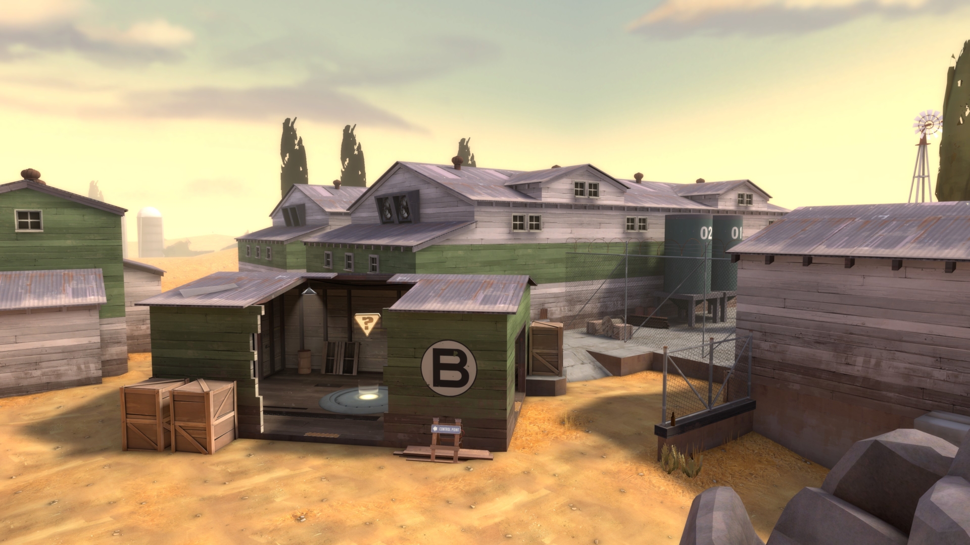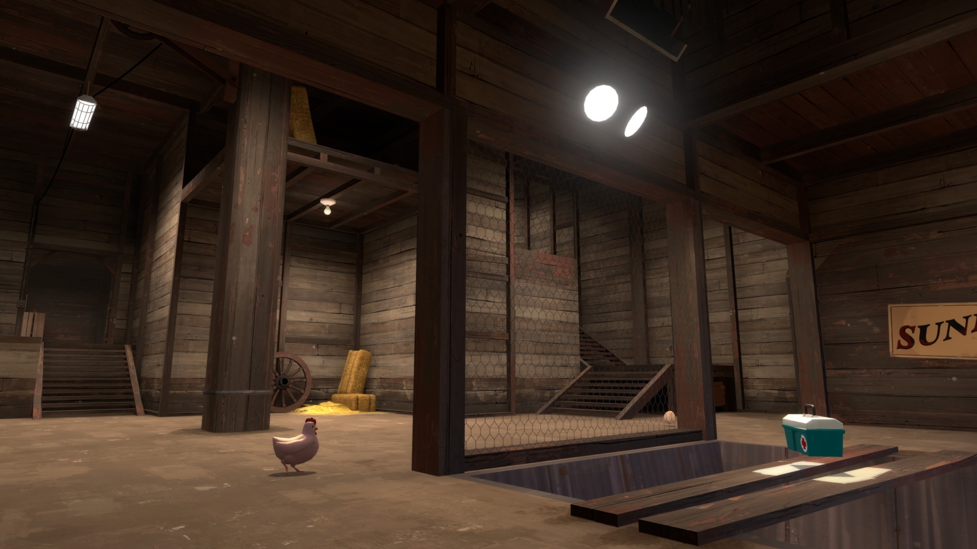 Unlike its older-sister map Caper, Sunnyside — named for the wholesome egg breakfast its bright yellow sky so closely resembles — sets its points in wide-open yards, with emphasis on distance play. (The chickens are free-range, after all.) These yards are lousy with sweet little hens, who will squat down every few steps and squeeze out a piping-hot egg that functions as a tiny health pickup.