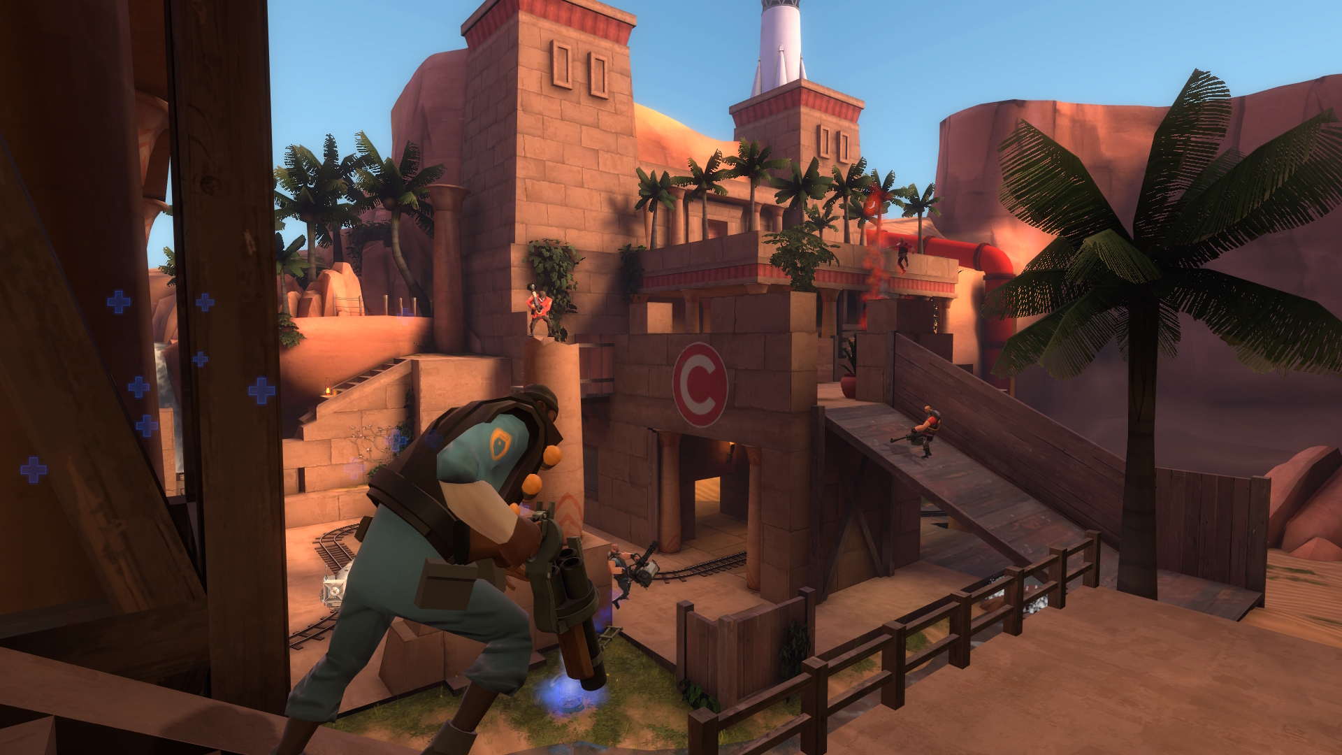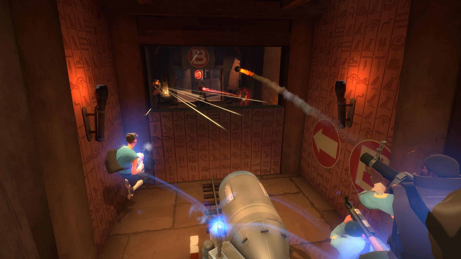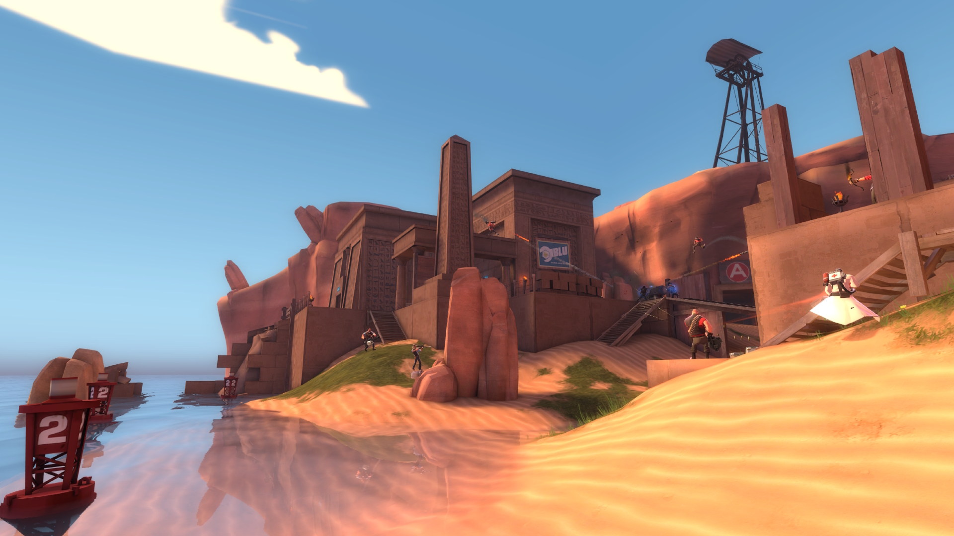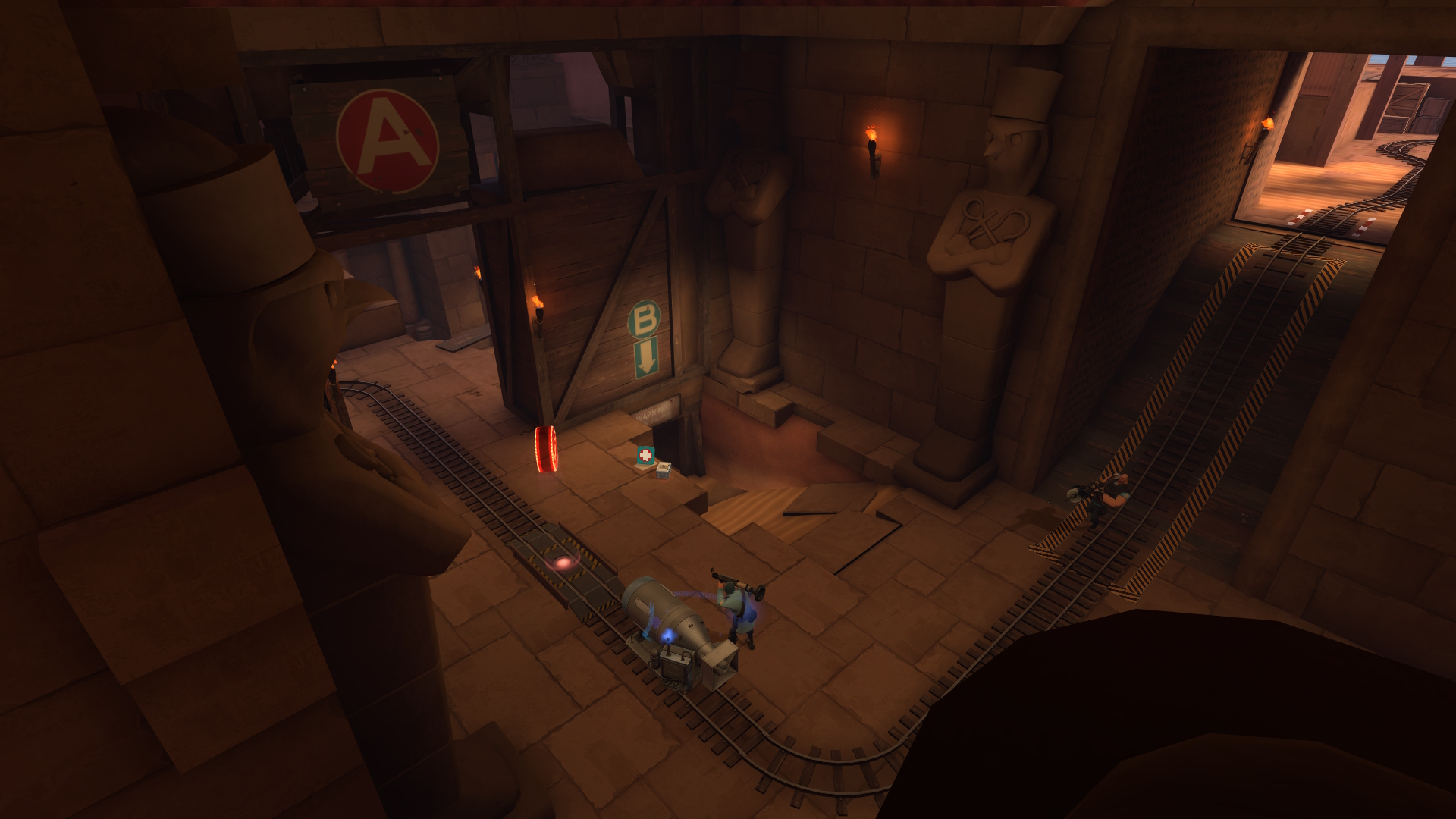 Oh, no! RED team is siphoning floodwater out of an ancient Egyptian burial site and using it as rocket fuel! Push a bomb-cart off a cliff onto their water pump so the honored dead and priceless artifacts are swept away into the river and lost forever, like nature intended.