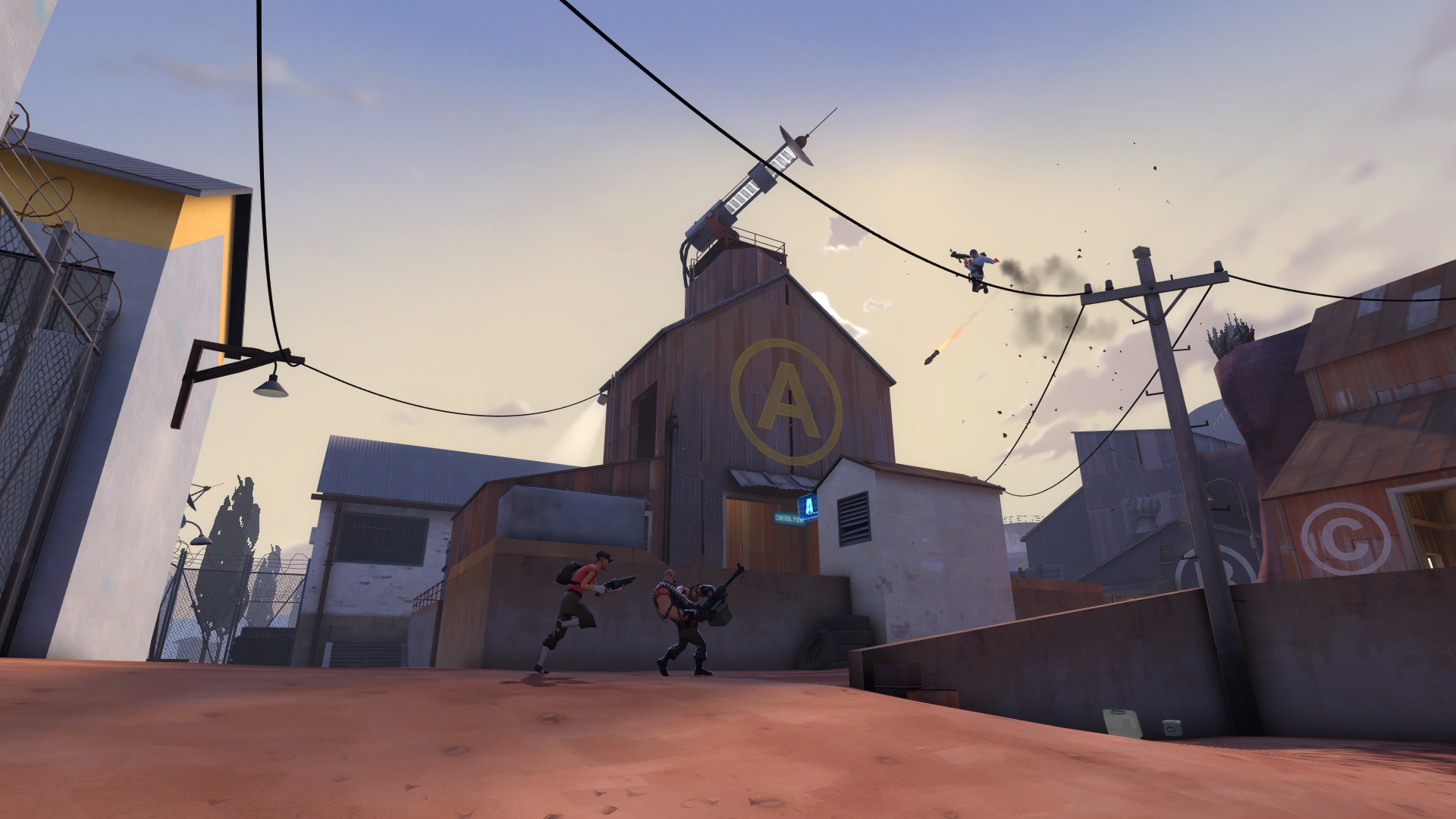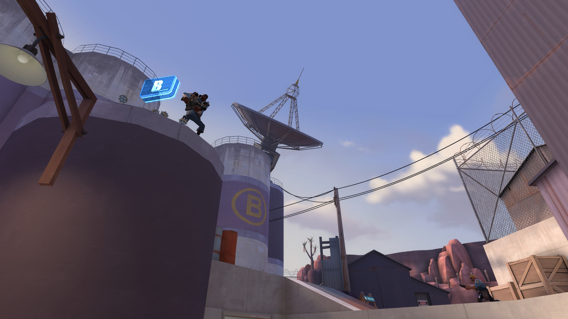 All good game modes need a 'multi-use industrial site in the desert'-type first map to set the tone, and Caper follows in that tradition. A barn-mounted space laser (off-yellow), relay dish (periwinkle) and water reservoir (#M410-7 "Perennial Green") are all ripe for the taking, as long as you don't take it too personally when they change hands ten times a round.